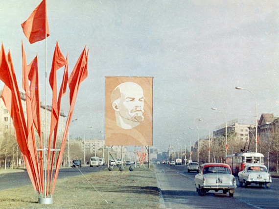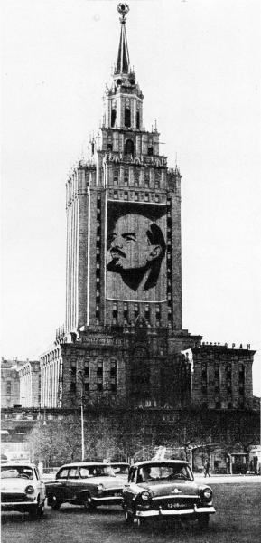 Напротив, на фасаде ГУМа разместился огромный декоративный щит в виде развивающегося алого знамени с профилем Ильича.