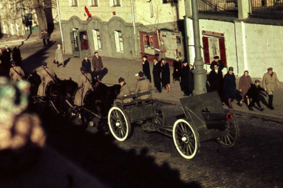 Необычайное зрелище представляли военный парад и как тогда говорили “демонстрация трудящихся Москвы”. Здесь отразились все этапы пятидесятилетней истории Советской страны — от красноармейцев, комиссаров и революционных матросов с тачанками и конницей, воинских подразделений времен Великой Отечественной с танками Т-34 и “Катюшами”, до новейших по тому времени воинских формирований с самой современной ракетной техникой. (54-58)