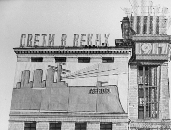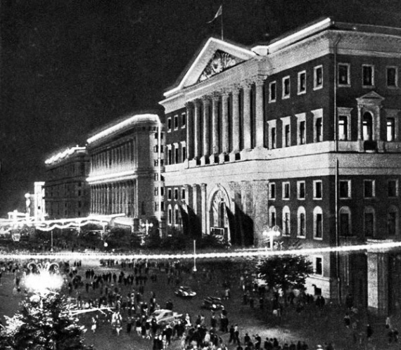 На здании Политехнического музея расположились электросилуэтные плакаты с пропагандой научно-технических достижений советской власти. Эта композиция имела красноречивое название «Впервые в мире».
