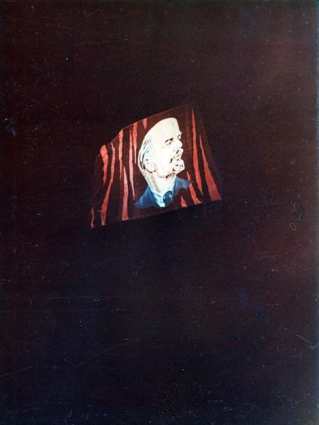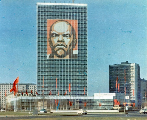 На фасаде гостиницы “Ленинградская” и на здании института “Гидропроект” появились гигантские изображения вождя, исполненные в оригинальной технике, впервые апробированное еще в довоенной Москве Михаилом Ладуром. Эти ленточные, “стереоскопические” портреты, давали на большом расстоянии иллюзию пространственности. Прием сводился к следующему: графический или живописный портрет, разрезали на узкие вертикальные полосы, вынимая каждую вторую из них. Из вынутых и оставшихся полос получались уже два изображения. Они и размещались с незначительными промежутками между полосами, на большой высоте, скрадывающей недостающие фрагменты. Эти “пустоты” с расстояния создавали вертикальный растр, придающий изображениям ажурность и прозрачность. Благодаря использованию такой техники исполнения, панно значительно уменьшалось в весе, снимались ветровые нагрузки, и как следствие, значительно увеличивалась площадь изображений.