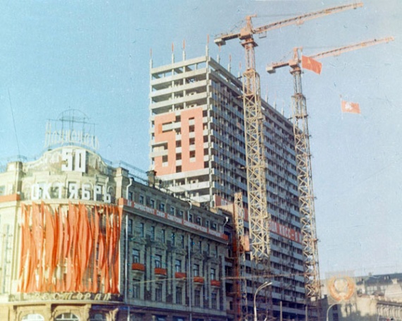 На фасаде универмага «Москва» размещались светящиеся цифры «50» и шлейф взлетающей ракеты.