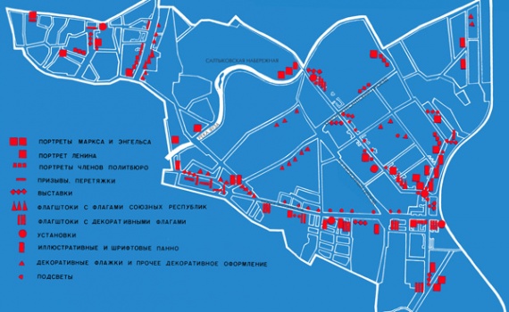 Над праздничным украшением Москвы, особенно ее исторической центральной зоны, работали многие известные художники-оформители, такие как К. Калайда, Н. Филатов, Б. Родионов, П. Шадриков, Б. Комов, М. Лавренов, А. Шорин, А. Ермольев, А. Галкин и др.