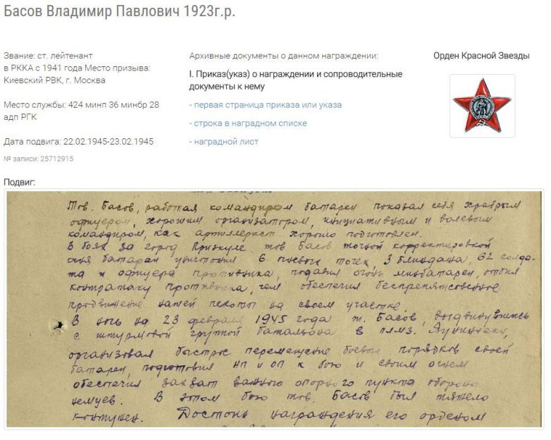 Затем старший лейтенант Басов был назначен командиром миномётной батареи, снова оказавшись не передовой – теперь уже с боевыми задачами. В феврале 1945 года был тяжело контужен в бою, успев отбить контратаку гитлеровцев и обеспечить захват советскими войсками важного опорного пункта обороны. После ранения вернулся в строй, закончил войну в звании капитана и в должности замначальника оперативного отдела артиллерийской дивизии. После окончания войны у Владимира Басова была возможность продолжить военную карьеру, но он спешил вернуться к своей мечте, поэтому демобилизовался и в 1947 году поступил во ВГИК на режиссёрский факультет.
