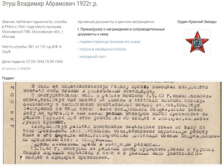 В составе разведроты Владимир Этуш оборонял Ростов. Потом было отступление через Кавказ, сражения в Ингушетии, освобождение Украины… Орден Красной Звезды Этуш получил в 1943 году. Молодой лейтенант под сильным огнём противника поднял в атаку солдат, рота выбила противника из населённого пункта и уничтожила тридцать гитлеровцев. Владимир Этуш вспоминает, что орден командир вручил ему буквально на бегу, во время очередного боя.