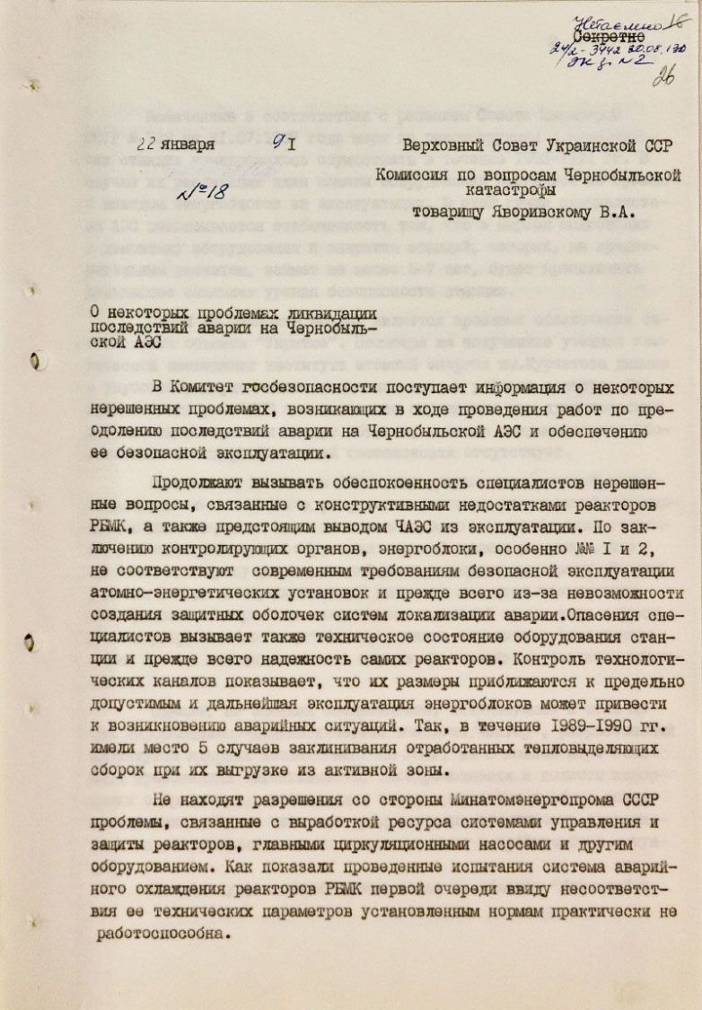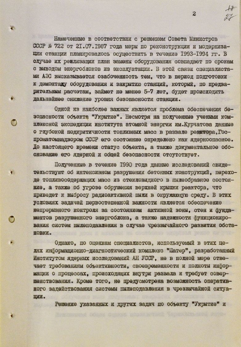 Объемная и очень интересная докладная записка, в которой говориться о многократном занижении реальных пострадавших от чернобыльской аварии, об ошибочном определении состояния разрушенного реактора («комиссия определила как „ядерно-опасное“, но сейчас никаких сведений о состоянии нет»).