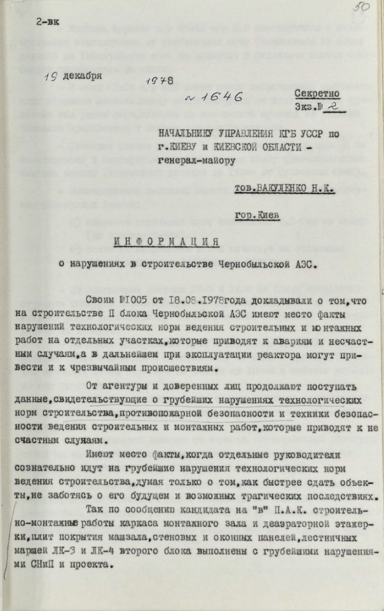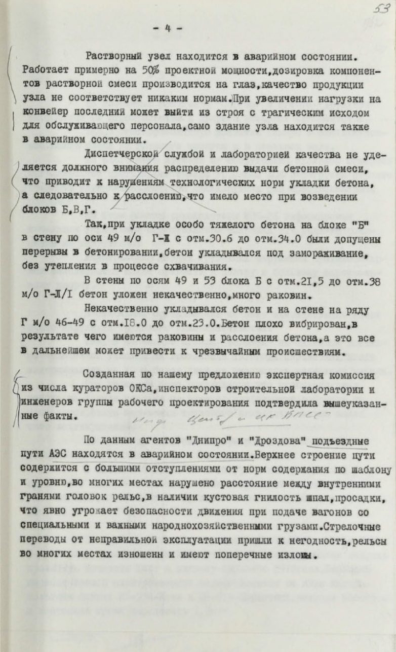 Документ номер три — весьма объемная докладная записка на имя начальника управления КГБ СССР по Киеву и Киевской области. Уже в первом абзаце текста говорится о серьезных нарушениях в строительстве станции, которые в дальнейшем могут привести в том числе и к авариям.