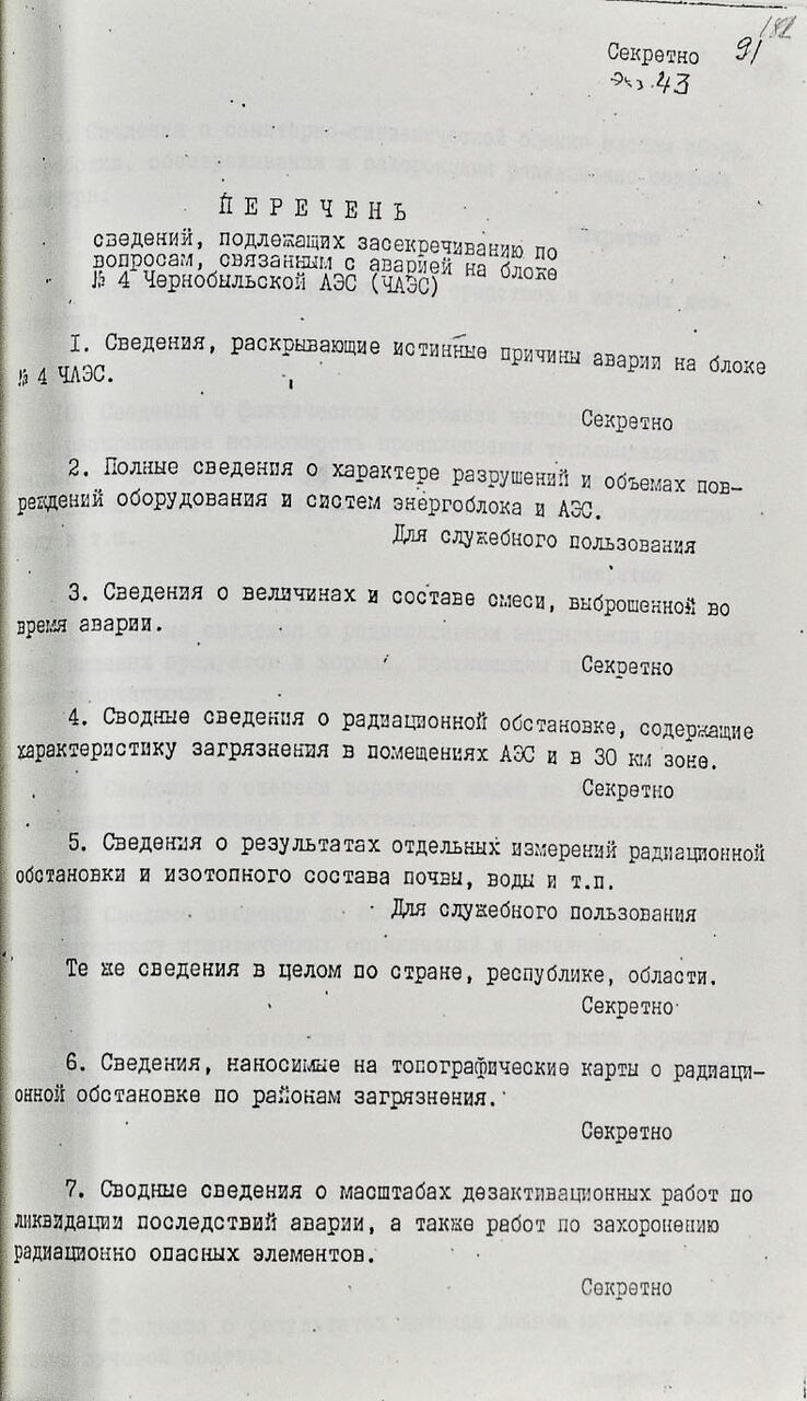 Июль 1986 года, перечень сведений об аварии на ЧАЭС, которые подлежат засекречиванию. Вот и подтверждение того, что истинные уровни радиации на кровлях Четвертого блока и машзала были скрыты даже от технических специалистов, производивших подготовку роботов для работ по дезактивации кровель станции, в результате чего роботы «сгорели» от радиации.