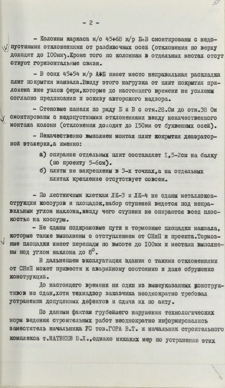 На второй странице речь идет об ошибках в покрытии машинного зала — возможно, в результате именно этого его крыша была пробита обломками активной зоны реактора в ходе аварии 1986 года. Много сказано там и про плохую гидроизоляцию энергоблоков.