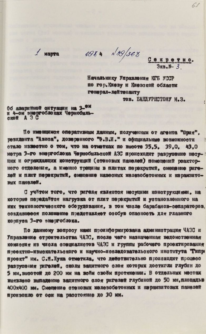 Докладная записка начальнику УКГБ СССР по Киеву и Киевской области Бандуристому ИМ.З. об аварийной ситуации на 3 и 4 энергоблоках ЧАЭС. 1984 год, за два года до апрельской катастрофы.