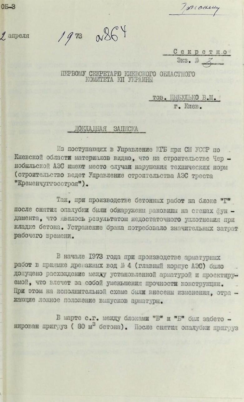 Первый документ — докладная записка Первому секретарю киевского обкома КП Украины Цыбулько В.М. о нарушении технических норм на строительстве Чернобыльской АЭС. Тематика записки напрямую касается технических нарушений в строительстве станции а также говорит про воровство материалов со стройплощадки — общую беду многих советских строек.