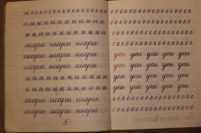 От автора: «Если верить истории, такие уроки проводились повсеместно в республиках СССР до середины 1970-х годов. Причем до 1968 года первоклашки на уроках каллиграфии орудовали не шариковой ручкой, а пером.»
