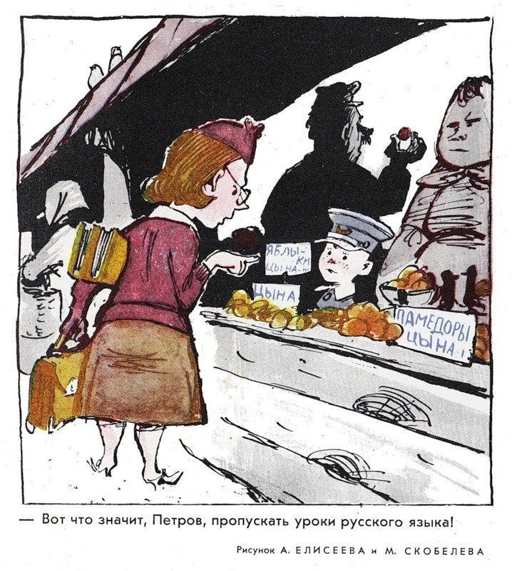 «Вот что значит, Петров, пропускать уроки русского языка» — любой продуктовый рынок или продуктовый ларёк сейчас. Учителям за двойки абсолютно тупых учеников сейчас приходится писать объяснительные сложнее, чем ментам за израсходованные патроны в экстремальной ситуации.