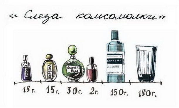 «Слеза комсомолки». Смешиваются между собой следующие компоненты — духи «Лаванда» (15 г), духи «Вербена» (15 г), духи «Лесная вода» (30 г), лак для ногтей (2 г), зубной эликсир (150 г), лимонад (150 г). Вот что писал про этот коктейль сам Ерофеев: «Пьющий просто водку сохраняет и здравый ум, и твердую память или, наоборот, теряет разом и то и другое. А в случае со “слезой комсомолки” просто смешно: выпьешь ее сто грамм, этой “слезы” — память твердая, а здравого ума как не бывало. Выпьешь еще сто грамм — и сам себе удивляешься: откуда взялось столько здравого ума? И куда девалась вся твердая память?»