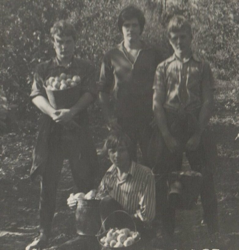 В сады лазали за яблоками(это фото не когда был поход за яблоками- это трудовой лагерь, здесь нам по 16 лет), нет не от голода, а ради адреналина, ели вишни, прямо с косточками и они не прорастали у нас в животах(кто в теме тот понял).