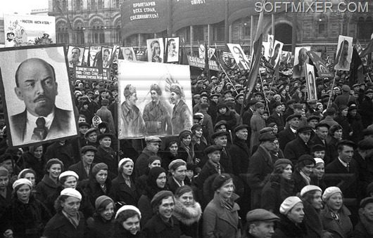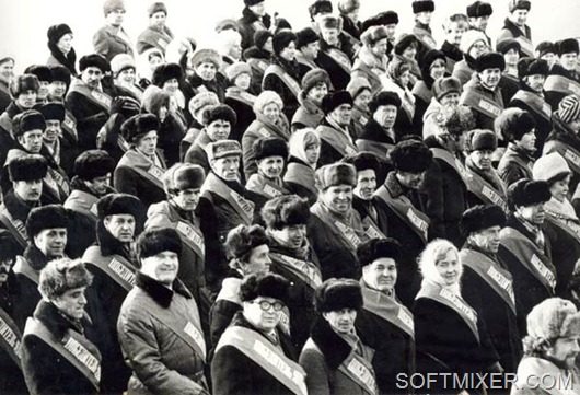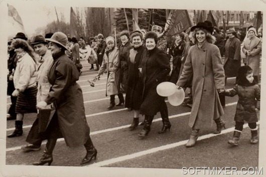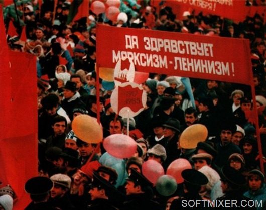 Наш начальник перед праздником предупреждал — «Кто на демонстрацию не придет тот о месячной премии может забыть!». И мы все всегда приходили. Брали с собой вина/водки/закуски, а для детей конфет и печенюшек и пока колонны собирались на прилегающих улицах успевали взбодриться/погреться, попеть песен и посплетничать. Так как сбор колонн каждый год и каждый праздник был на одном и том же месте, то облюбованный уголок за углом ЦНИИТС был традиционно «нашим местом». Иногда подходили милиционеры и просили не шуметь и выпивку особо не демонстрировать. Но никого не забирали и протоколов не составляли. Потом начиналась гонка колонн — бегом выравнивали ряды, и с громким «УРА!!!» проходили перед трибуной с первым секретарем края. Там, ко времени нашего прохода, уже уставали стоять и замерзли. И так же шли в импровизированный буфет организованный за трибунами и повышали градус настроения соответствующими напитками. Не подумайте что наговор — самого как-то раз «выдвинули» на трибуну, промерз там почти три часа и «согревался» вместе с первыми людьми.