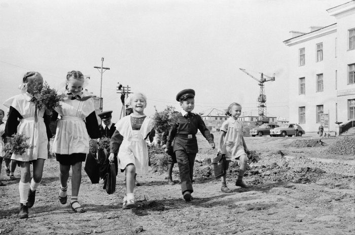 Маленькая поправка. Белые фартуки у девочек и белые рубашки у мальчиков были атрибутом пораднтй формы. Каждодневная форма предполагала коричневый или черный фартук для девочек. У мальчиков под пиджак шла любая однотонная рубашка и галстук. В старших классах — обычный галстук. С 4 по 7 класс — пионерский галстук в младших классах можно было ходить вовсе без галстука.