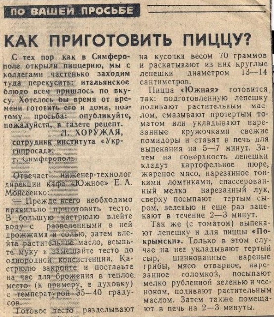 Я помню, на обеде, одна наша сотрудница принесла домашнюю пиццу. Это был толстенный корж, на котором был не менее толстенный слой картофельного пюре и маринованные огурчики порезанные мелкими кубиками. Сотрудница очень настойчиво всех пыталась угощать этим кулинарным шедевром. Приходилось брать совсем немного, ссылаясь на то, что уже сыт.