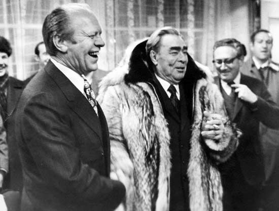 Леонид Ильич пытается разговаривать с новым президентом США Джеральдом Фордом точно также, как с Никсоном. Но похоже Форд его не очень понимает и малость напряжён.