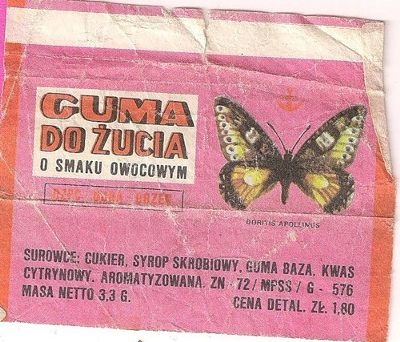 Это польская жвачка. Тоже упаковка с пятью пластинками, однако, с более интересными картинками. Называли мы их «смешинками». Они рассказывали о приключениях героев популярного тогда одноименного польского мультика. У моего старшего брата было много таких, а у друзей — не было. Видимо, эта жвачка была распространена в 70х-начале 80х.