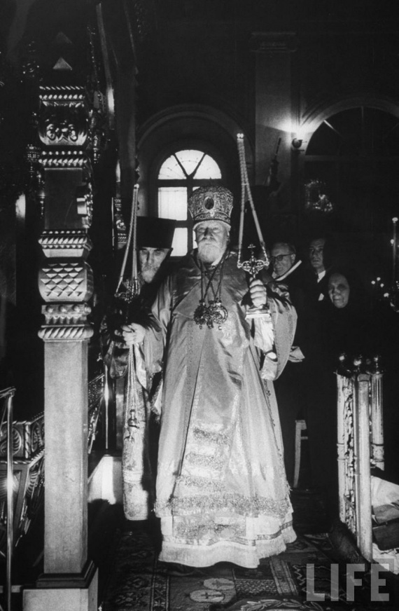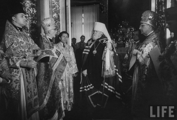 Группа американских священников, участвующих в русской православной службе с патриархом Московским.