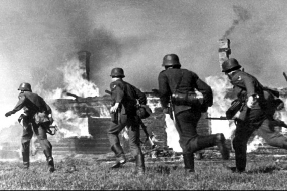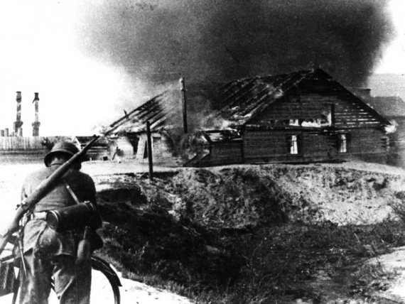 Немец поджигает дома в деревне