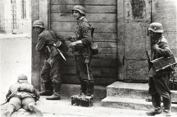Немецкие солдаты в уличном бою в Прибалтике.