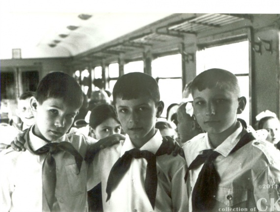 Было подписано: «В Ворзель в пионерский лагерь». Судя по внутренней отделке вагона, это ещё электропоезд серии ЭР9П с характерной полукруглой «мордой».