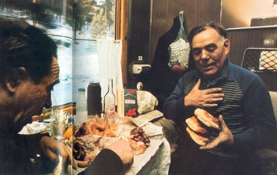 Ветеран Абрам Мордухович и действующий полковник Дмитрий Бояркин обедают в купе состава, несущегося по Транссибу.