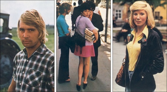 Работник опорно-показательного совхоза «Саку» под Таллином ненадолго оторвался от заготовки сена. Стильно одетые студентки Ереванского университета расходятся после занятий. Латвийка носит значок значок из далеких США — очевидно, подарок туриста. (Надпись на значке: «Virginia is for lovers» — ВК)