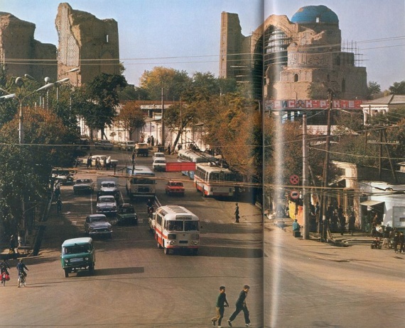 За перекрестком в центре Самарканда возвышаются руины мечети Биби-Ханум в реставраторских лесах.