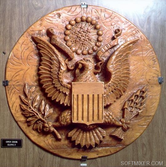 В 1945 году советские школьники подарили американскому послу деревянное панно из ценных пород дерева с изображением герба США. Ни школьники, ни посол не знали, что в панно вмонтировано подслушивающее устройство, конструкция которого была разработана Львом Терменом. «Жучок» был так удачно спрятан, что американские спецслужбы ничего не заметили, а советские разведчики ещё 8 лет прослушивали разговоры в рабочем кабинете посла. После обнаружения устройство было представлено в ООН в качестве доказательства разведывательной деятельности СССР, однако принцип его действия еще несколько лет оставался неразгаданным.
