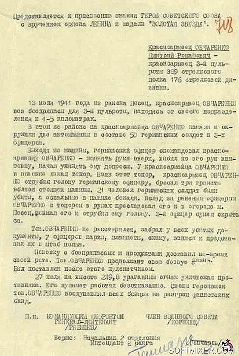 Согласно описанию подвига красноармейца Дмитрия Овчаренко из указа о вручении ему звания Героя Советского Союза, 13 июля 1941 года он доставлял боеприпасы в свою роту и был окружён отрядом солдат и офицеров противника численностью 50 человек. Несмотря на то что у него отобрали винтовку, Овчаренко не растерялся и, выхватив из повозки топор, отрубил допрашивавшему его офицеру голову. Затем он бросил в немецких солдат три гранаты, уничтожив 21 человека. Остальные в панике разбежались, кроме ещё одного офицера, которого красноармеец догнал и также отрубил ему голову.