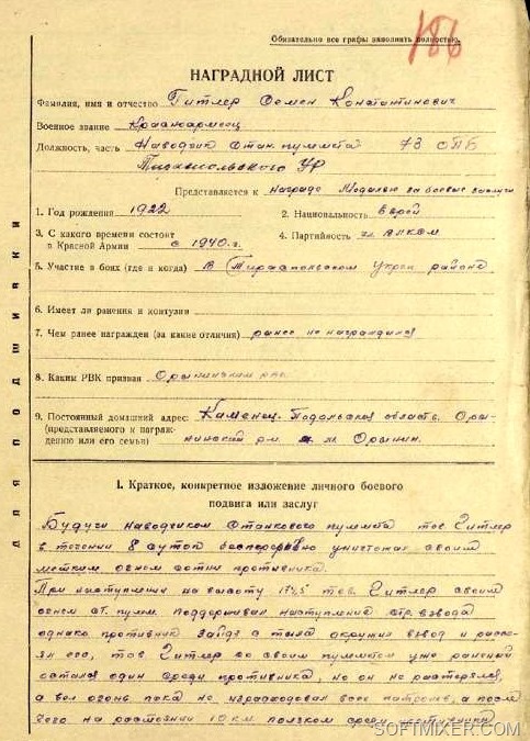 В Великой Отечественной войне принимал участие красноармеец-пулемётчик Семён Константинович Гитлер, еврей по национальности. Семьдесят лет назад при обороне высоты 174,5 Тираспольского укреп. района Семен Константинович огнем пулемета уничтожил более сотни военнослужащих Вермахта. Израсходовав боезапас, получив ранение и оказавшись впоследствии в окружении, красноармеец не бросив оружия, преодолев более 10 километров, вышел к своим. Что и подтверждается наградным листом от 19 августа 1941 года. Подвиг красноармейца Гитлера тянул по статуту на «Красную звезду», но вытянул только на «Отвагу». Фамилия помешала? Хотя в начале войны награждали с большим скрипом и «За Отвагу!» 41-ого года стоит ордена редакции 45-ого. Сохранился наградной лист, согласно которому Гитлер был представлен к медали «За боевые заслуги» за совершение подвига. Правда, в базе данных «Подвиг народа» сообщается, что медалью «За отвагу» награждён Семён Константинович Гитлев — случайно или намеренно была изменена фамилия, неизвестно.
