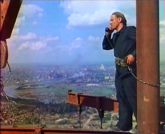 Строитель-верхолаз. Внизу — Лужники: