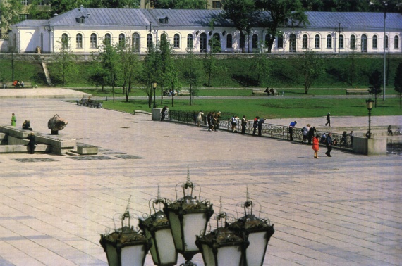 Район площади 1905 года в сторону Городского пруда. Справа — часть площади с памятником В.И. Ленину и трибуной. Посередине снимка — строительная площадка Дома Советов.