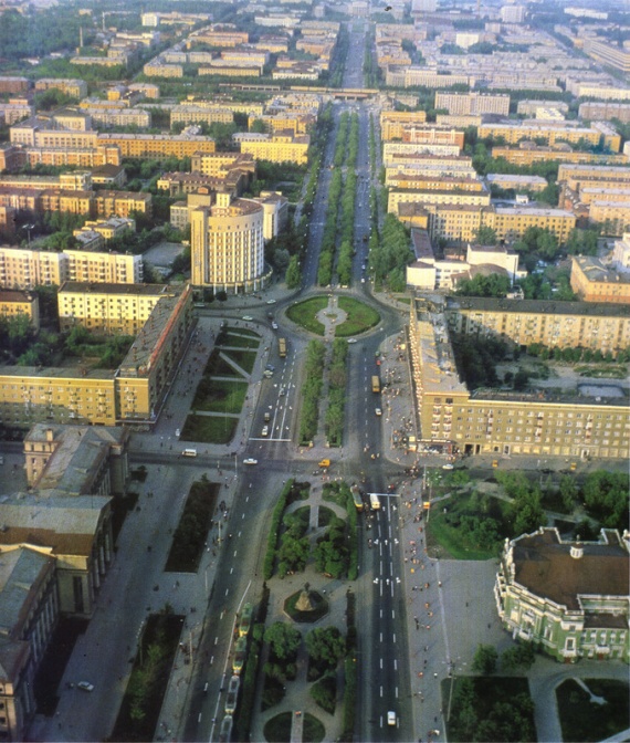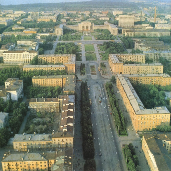 Площадь Коммунаров. Пересечение проспекта Ленина с Московской улицей. Посередине — сквер. За ним Дворец Молодежи и налево — Визовский бульвар с парком имени XXII съезда партии.