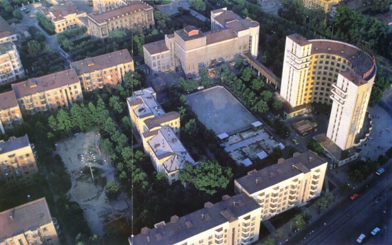 Городок чекистов. Подковообразное здание — гостиница «Исеть». Оно связано переходом с комбинированным зданием клуба имени Ф. Э. Дзержинского и универсального магазина. В середине городка — детские учреждения.