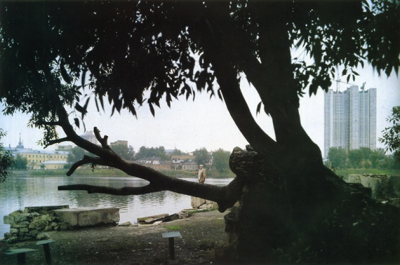 Юго-западный берег Верх-Исетского пруда. Начало застройки будущей набережной жилого района ВИЗ-правобережный. (Фотография на развороте и с убежавшими цветами. Так и не выровнял.)