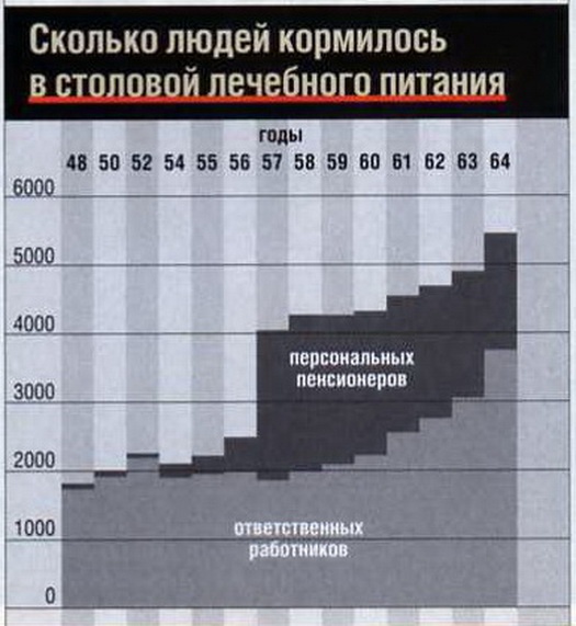 Несмотря на то что комиссия достаточно строго относилась к отбору кандидатов, количество прикрепленных росло с каждым годом (см. график). И для персональных пенсионеров пришлось открыть отдельную столовую в Комсомольском переулке в Москве. Но тут же возникло недовольство у старых большевиков Питера — пришлось особое питание и для них. Кроме столовой, существовала еще и система заказов продуктов за полную стоимость (которая, правда, была значительно ниже существовавшей в госторговле). Раз в десять дней или две недели министр или завотделом ЦК мог заказать определенное количество продуктов. Находились руководители, которые пытались заказывать продукты чаще, но в этом случае их заказы просто не исполнялись.