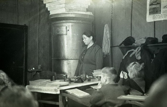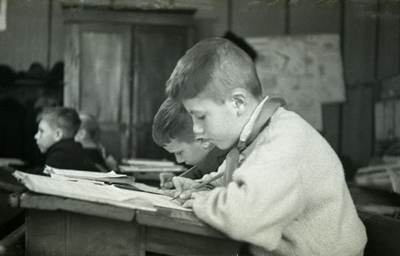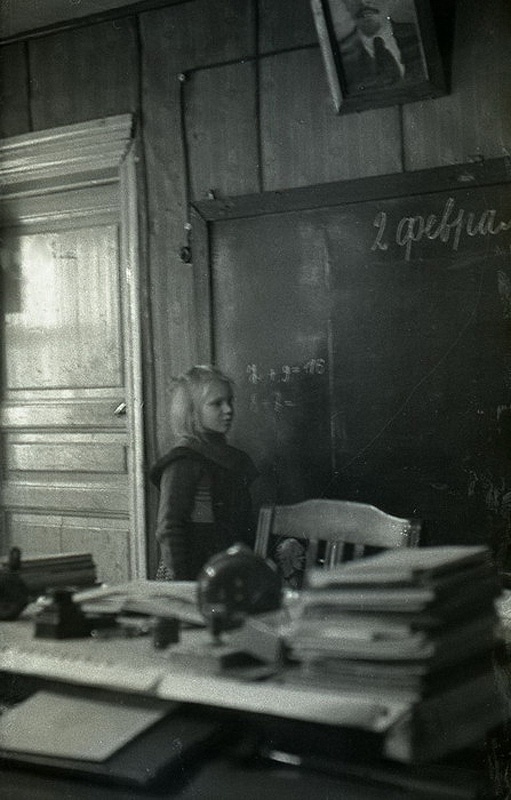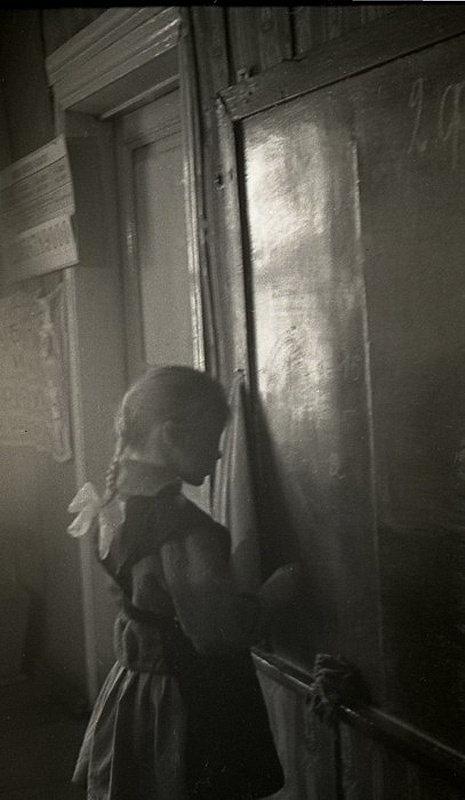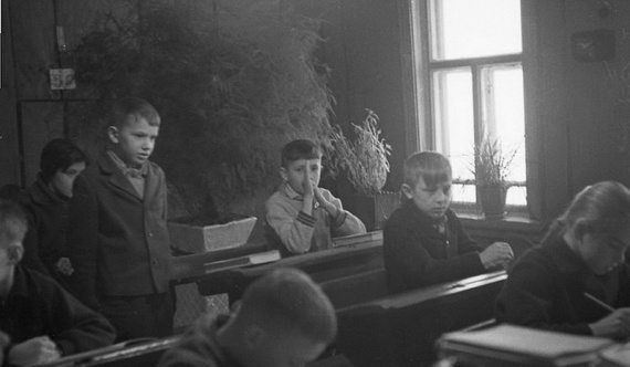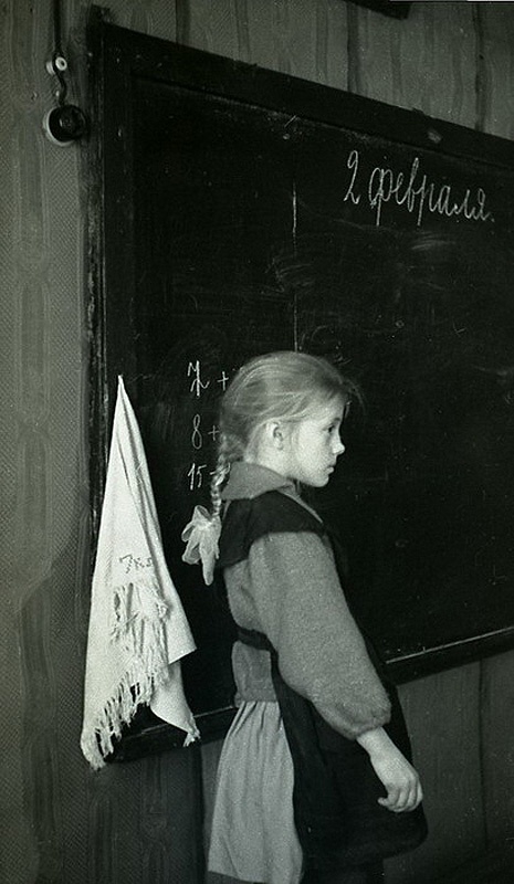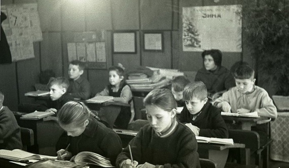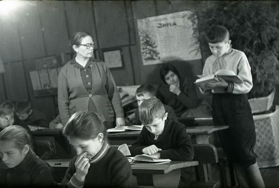 Урок в начальной сельской школе 1964 года. “Ученики с первого по четвертый класс в одной комнате, –Девочки с одинаковыми косичками. Круглая печка-голландка. Пальтишки и шапки на вешалке в углу…”