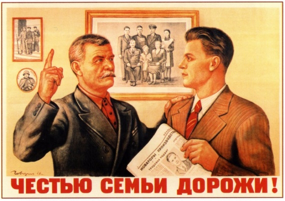 Наконец, социальная реклама в сталинском СССР пропагандировала даже такие вечные и внеклассовые ценности и понятия, как, например, «честь семьи».
