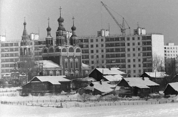 Москва, Юго-запад, церковь Михаила Архангела, д.тропарёво, на заднем плане дом № 123 по пр.вернадского, примерно 1972 г.
