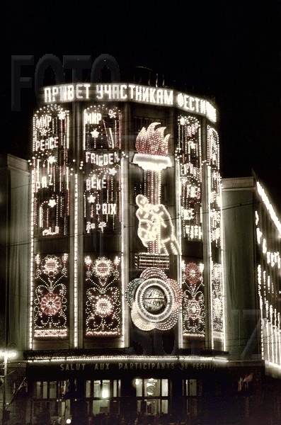 Вечерняя Москва в дни шестого международного фестиваля молодежи и студентов. Московский телеграф, Улица Горького (ныне — Тверская). Михайлов Андрей, 1957: