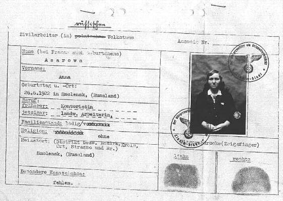 Удостоверение личности девушки-остарбайтера из Смоленска.