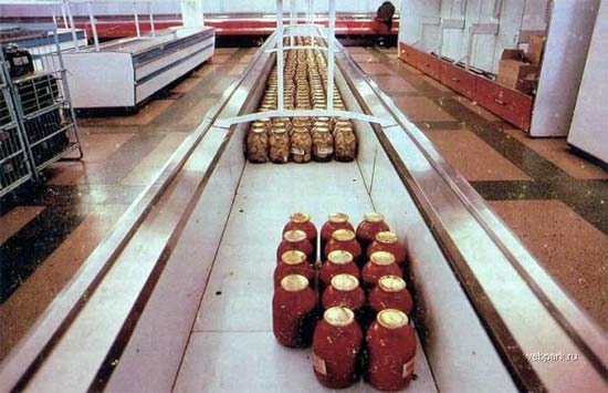 1974 год. Типовой продуктовый магазин. Опять же: пирамида из рыбных консервов, бутылки шампанского, батарея зелёного горошка «Globus» (венгерского, кажется, или болгарского – не помню что-то уже). Поллитровые банки с чем-то вроде тёртой свёклы или хрена с свёклой, пачки папирос, бутылка армянского коньяка. Справа (за весами) пустые колбы для продажи сока. Сок обычно был: томатный (10 копеек стакан), сливовый (12 или 15, не помню уже), яблочный (тоже самое), виноградный (аналогично). Иногда в Москве бывал мандариновый и апельсиновый (50 копеек – дико дорого). Рядом с такими колбами обязательно было блюдце с солью, которую можно было ложечкой (взятой из стакана с водой) добавить в свой стакан томатного сока и размешать. Я завсегда любил пропустить стаканчик томатного сока.