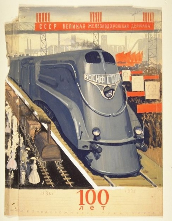 Шикарный плакат 1938 года к 100-летию ж.д. в России: