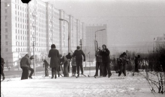 5. В долгие зимние месяцы советские школьники занимались физкультурой на беговых лыжах. МГУ, Москва, 1959 год