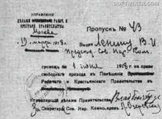 Пропуск № 43 Председателя Совета Народных Комиссаров В. И. Ленина на право свободного входа в помещение правительства.