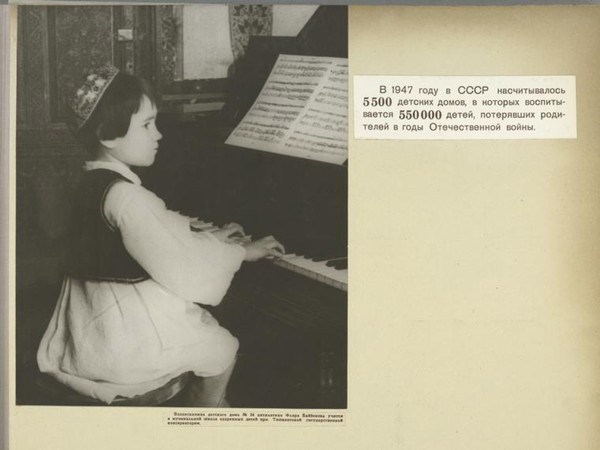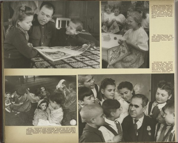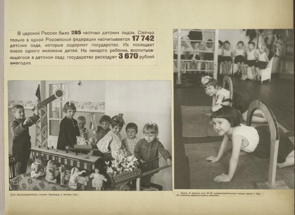 Иллюстрации повседневной жизни советских детей с момента их появления на свет. Почти каждая страница альбома пестрит радужными статистическими данными: о количестве детских садов и школ, темпах развития СССР и повышения уровня благосостояния советских ребят.