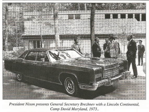 «Я сделал ему официальный подарок на память о его визите в Америку — темно-голубой „Линкольн-Континенталь“ индивидуальной сборки. На приборной панели была выгравирована надпись: „На добрую память. Самые лучшие пожелания“. Брежнев коллекционировал роскошные автомобили и поэтому не пытался скрыть своего восхищения. Он настоял на том, чтобы немедленно опробовать подарок. Он сел за руль и с энтузиазмом подтолкнул меня на пассажирское сиденье. Глава моей личной охраны побледнел, когда увидел, что я сажусь вовнутрь. Мы помчались по одной из узких дорог, идущих по периметру вокруг Кэмп-Дэвида. Брежнев привык беспрепятственно продвигаться по центральным улицам Москвы, и я мог только воображать, что случится, если джип секретной службы или морских пехотинцев внезапно появится из-за угла на этой дороге с односторонним движением. В одном месте был очень крутой спуск с ярким знаком и надписью: „Медленно, опасный поворот“. Даже когда я ехал здесь на спортивном автомобиле, я нажимал на тормоз, чтобы съехать с дороги вниз. Брежнев ехал со скоростью более 50 миль (80 км) в час, когда мы приблизились к спуску. Я подался вперед и сказал: „Медленный спуск, медленный спуск“, но он не обратил на это внимания. Мы достигли конца спуска, пронзительно завизжали покрышки, когда он резко нажал на тормоза и повернул. После нашей поездки Брежнев сказал мне: „Это очень хороший автомобиль. Он отлично идёт по дороге“. „Вы великолепный водитель, — ответил я. — Я никогда не смог бы повернуть здесь на такой скорости, с которой вы ехали“. Дипломатия — не всегда лёгкое искусство».